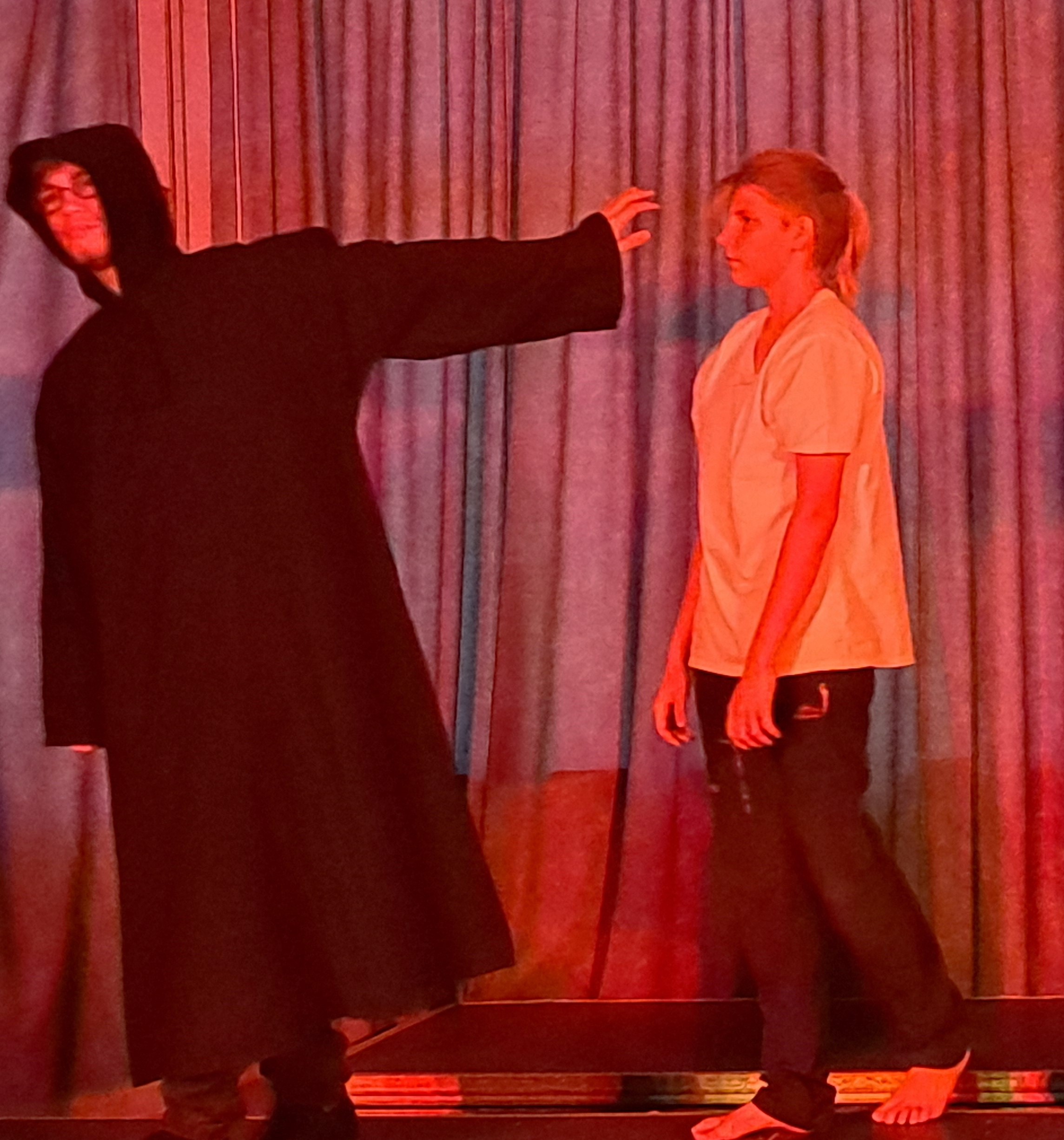 Die Schüler*innen hatten sich gemeinsam für dieses doch recht düstere Stück entschieden, weil es zum einen durch die schwarze Magie in der Mühle sehr spannend ist und zum anderen, weil Freundschaft, Zusammenhalt und Liebe am Ende doch über das Böse siegen. Diese Hoffnung kann die ganze Düsternis überstrahlen und das brachten die jungen Menschen gemeinsam gelungen auf die Bühne.